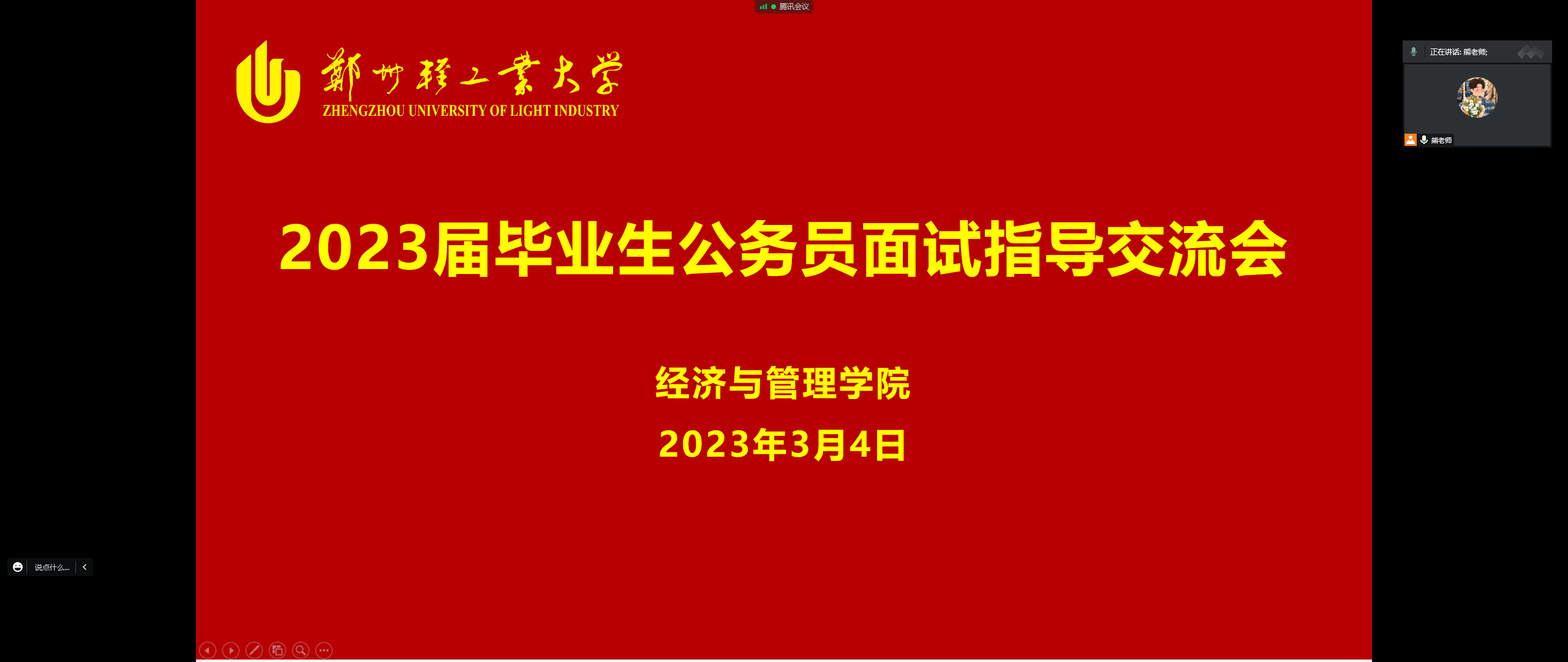 为进一步促进毕业生对公务员面试的了解,提升面试能力,掌握更多面试技巧,3月4日中午,经济与管理学院举办了2023届毕业生公务员面试线上指导交流会。学院就业专职辅导员、报考公务员的毕业生等100余人参加了会议。