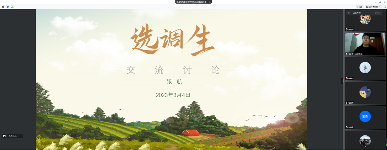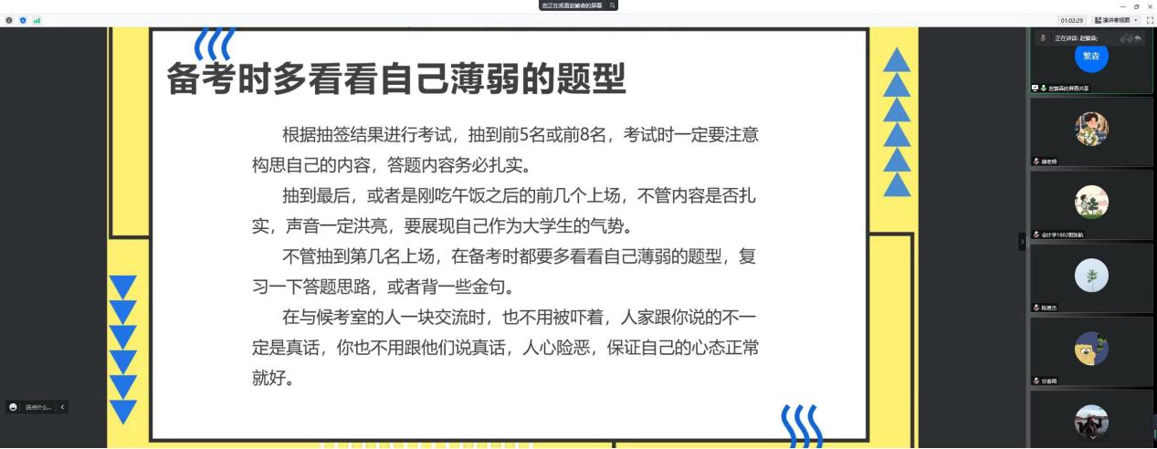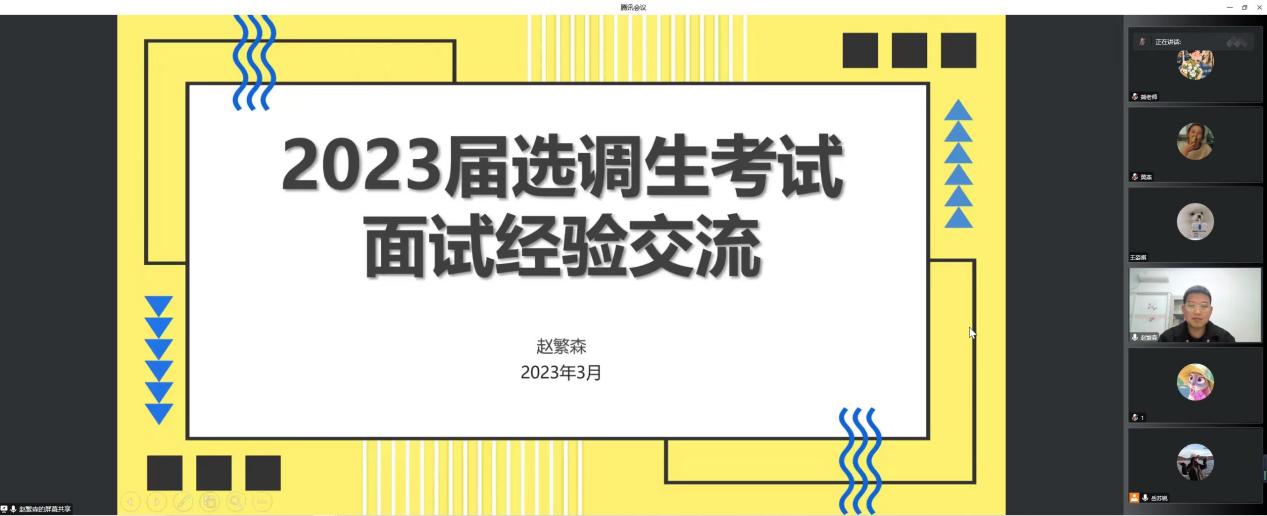 我院邀请了两名2022届成功考取选调生的毕业生张航、赵繁森为大家做经验分享,并为参会同学就面试问题答疑解惑。两位毕业生先后从备考思路、学习方法、面试技巧、心态调整四个方面,通过PPT展示讲解、回答参会学生问题两种形式,结合往年的录取分析和例题讲解,细致分享了选调生面试的备考建议。张航还向同学们展示了众多工作照和选调生“上岸”后在基层工作的所见所思所想,鼓励同学们积极把握深入农村基层锻炼的宝贵机会。同时,他现场为同学们分析了几道面试题型,生动地讲解在理清问题的同时化解了部分同学应试前的紧张情绪。