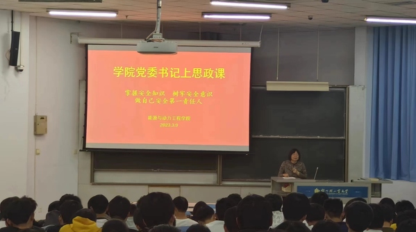 为进一步提高学生安全防范能力,增强学生安全防范意识,普及各类安全常识,确保学生在网络和学习生活中的安全,2023年3月9日晚,能源与动力工程学院党委书记邵建敏在东风校区教三楼202给2022级全体学生上了一堂题为“掌握安全知识 树牢安全意识 做自己安全第一责任人”的思政课。