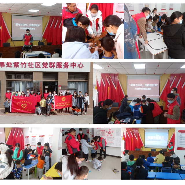 为弘扬“奉献、友爱、互助、进步”的志愿服务精神,宣传科技文化知识,提高学生的创新能力、协作精神。3月19日上午,物理与电子工程学院青年志愿者服务队在紫竹社区举办“展电子技术,览物理世界“科技作品展览志愿服务活动。