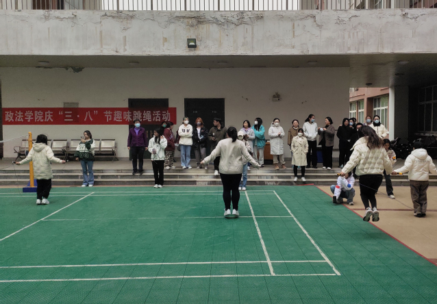 为庆祝“三•八”妇女节,丰富女教职工业余文化生活,展现女教职工蓬勃向上、积极进取的精神风貌,3月23日下午,政法学院工会在政法楼北广场举办了2023年庆“三•八”节女教职工趣味跳绳活动。