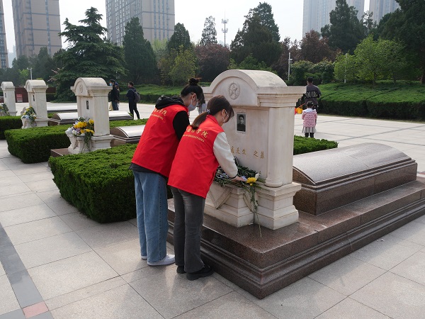 在教室,团支书带领青年团员从革命烈士永垂不朽,追思缅怀抗疫英雄,铭记责任致力中华复兴三个方面寄托哀思,缅怀英雄。革命战争时期,无数烈士为了人民的幸福、民族的解放英勇战斗,直到流尽最后一滴血,永远长眠于我们脚下的这片热土;和平年代,抗疫英雄以生命护佑生命,为我们筑起了牢不可破的“生命防线”。通过学习,青年学子深刻感受到革命烈士们崇高的爱国精神和矢志不渝的无私奉献精神。在宿舍,团支部号召同学们通过网站或手机开展网上献花、留言寄语等活动,表达对英烈敬仰缅怀之情。在郑州烈士陵园,团员志愿者敬献鲜花;擦拭烈士墓碑、英名录;清扫园内枯枝落叶、纸屑等,以实际行动表达对革命先烈们的瞻仰之情。