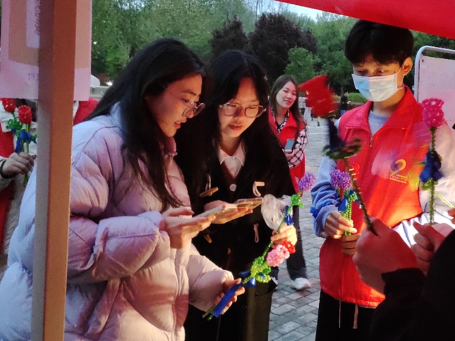 44日上午,活动一开始,便吸引了大量师生驻足,志愿者也积极地在义卖场地耐心地指导同学们如何进行义卖物品购买,并积极宣传介绍本次义卖活动的意义。在下午活动现场,还来了两位特殊的志愿者,她们是两位唐氏同龄人,在二七汇爱工作,运营一家温馨小店——糖星汇爱烘焙店。她们与我们有些不同之处,但更多的是相同之处,爱花,爱美,爱与这个有爱的世界交流。她们和志愿团队一起向同学们介绍自己的烘焙作品。现场来咨询和购买的同学老师络绎不绝,活动气氛热烈。义卖结束,天光虽然暗沉了下来,但是同学们的心里却是温暖又明亮。在大家的热情支持下,发夹、手工香皂、面包等义卖物品全都兜售一空,整个活动现场暖意涌动,大家不仅买到了自己喜欢的物品,更重要的是为爱心工程尽了自己的微薄之力。