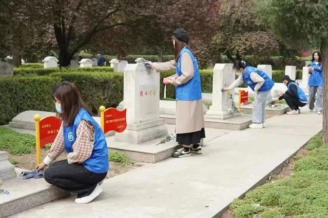 在此次团日活动中,各团支部通过组织参观英烈纪念馆、祭扫烈士陵园、观看视频短片、PPT故事分享会等丰富多彩的活动,表达了对革命先烈、身边先进模范人物的追思、敬仰和学习之情。首先是简述清明历史,知晓清明节的来历和传统习俗;接着,通过视频短片和领学分享,把惊天地、泣鬼神的雄壮史诗向同学们一一讲述,同学们纷纷被先辈们的英雄事迹所感动和鼓舞。在中原英烈纪念馆,同学们怀着虔诚的心情和崇高的敬意,瞻仰革命先烈的英雄事迹,大家仔细擦去烈士碑志铭上的浮尘和落叶,内心充满了对英雄烈士的敬仰和对美好生活的感恩。