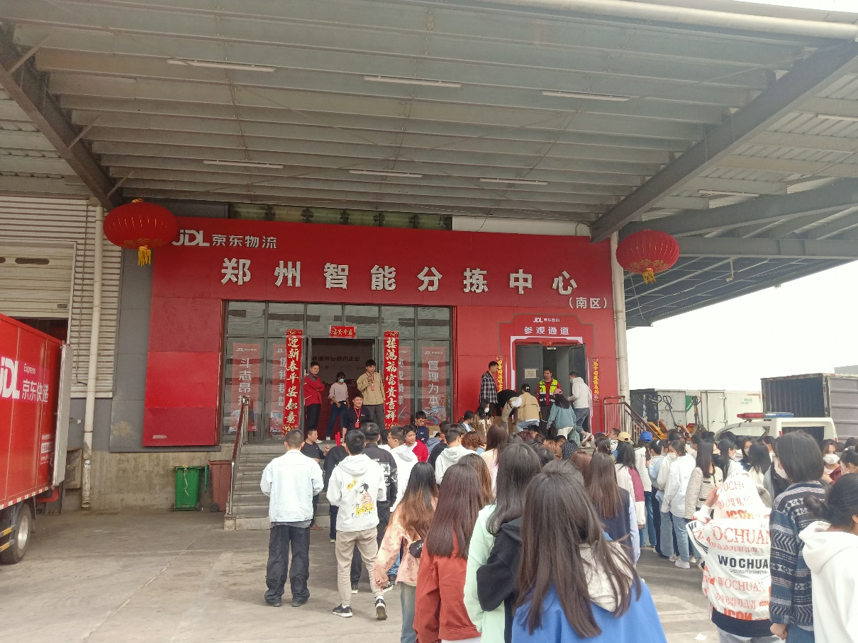 同学们主要参观了该物流园区京东郑州前程分拣中心,首先映入眼帘是一辆辆的大货车把来自于周边省市的众多商品运到该中心,员工们对这些单一的商品进行批量手动入库,在另一侧看到一辆辆的小型配送车辆在装货,把分拣好的商品装上车,继而快速驶离园区。在分拣中心内部,工作人员耐心地进行业务的讲解,同学们看到了立体仓库,自动装卸机和自动分拣机的工作场景,感受到了科技的力量,最后用户的订单完成后需要人工进行包装,工人们根据商品的具体情况选择大小不同的包装箱并填充防潮、防摔、防移动的填充物,工人们技术娴熟,将贴好标签的快递箱(盒)放在传送带上,机器根据用户的地址自动分拣到不同的出口,待装车配送。给同学们留下印象最深的是智能分拣机器人——“小黄人”,工作人员只需要把包裹放到它的托盘上,它就能自动识别快递面单信息,自动完成包裹的扫码及称重,还能以最优线路完成货品的分拣和投递,每小时最高分拣量能达到1.6万件,保证包裹能在24小时之内送达消费者手中。