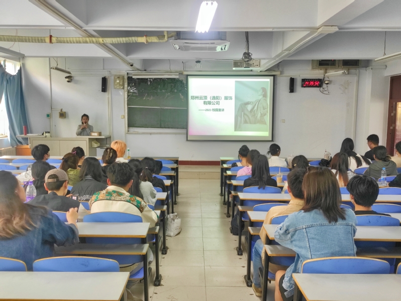 4月19日下午,艺术设计学院在西五楼301举行了郑州云顶服饰有限公司专场招聘会。郑州云顶服饰有限公司人力资源管理部门刘莹、朱肖亚、刘晓会等代表公司参加了此次招聘会,教师代表以及学院2023届应届毕业生约70余人参加了本次活动,活动由服装设计与工程系主任王永刚主持。