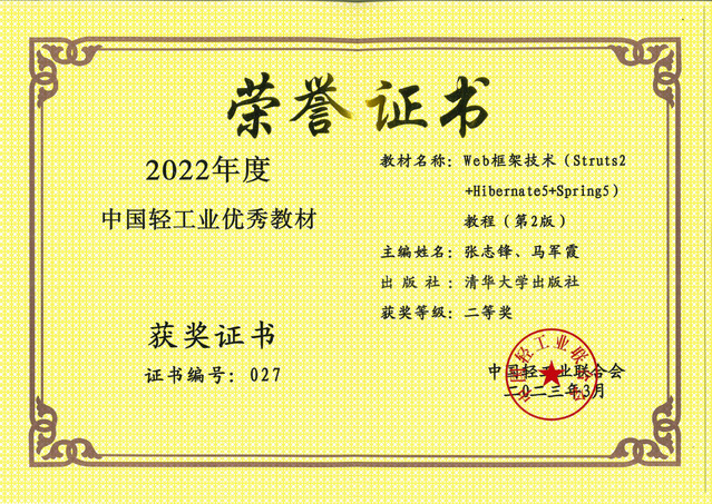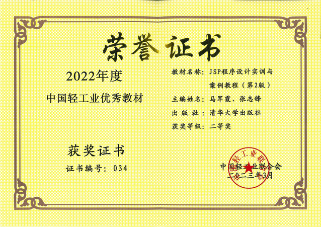 近日,中国轻工业联合会发布了《关于公布中国轻工业优秀教材等项目审定结果的通知》(中轻联教育[2023]69号),公布了第四届“中国轻工业优秀教材”的审定结果,我院两部教材《Web框架技术(Struts2+Hibernate5+Spring5)教程(第2版)》《JSP程序设计实训与案例教程(第2版)》荣获二等奖。