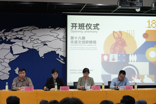 2023年5月22日上午,由河南省文化和旅游厅指导、18新利直播主办的“中国非物质文化遗产传承人研修培训计划——非遗文创研修班”在18新利直播 开班。河南省文化和旅游厅非遗处南乐天主任、18新利直播 艺术设计学院院长魏华教授、非遗研究中心办公室主任王潇博士、研修班班主任史鹏飞博士,师资团队教师代表,以及来自全省17个地市的非遗研培班学员参加了开班仪式,开班仪式由王潇博士主持。