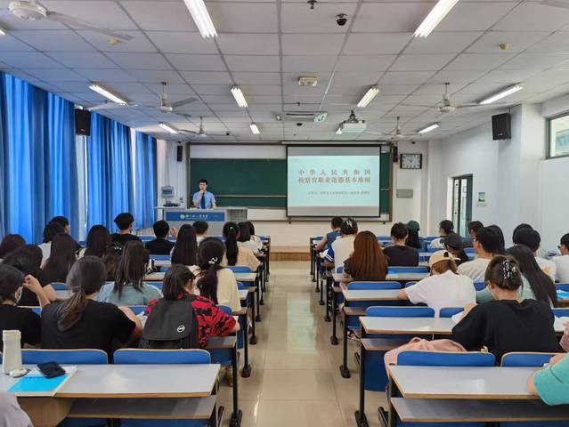 近日,政法学院邀请郑州市人民检察院第六检察部郭博浩检察官在科学校区二教楼804为学院师生作了题为《检察官职业道德基本准则》的实务讲座。政法学院教师代表、法学2022级本科生参加此次讲座,讲座由法学系系主任张威主持。