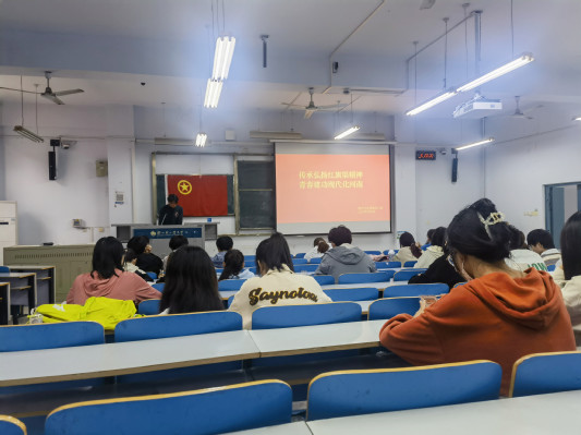 首先,各团支部集中观看了纪录片《红旗渠》片段,影片中一个个写实的镜头、一帧帧朴素的画面,记录了上世纪60年代林县人用铁锤、挖锄和簸箕等简陋工具,在难以攀爬的崇山峻岭中,历经十年苦战,辟开太行山,引漳入林,一举改变了全县千百年来世代缺水、干旱贫困的落后面貌。观看影片后,广大青年学子们结合学习、生活实际先后分享自己对于红旗渠精神的感悟和理解。最后,团支书带领全体青年学子重温入团誓词,并要求大家坚定理想信念,发扬艰苦奋斗作风,努力学习新知识、新理论,努力成为优秀的新时代人才,在青春的赛道上争取跑出当代青年的最好成绩。