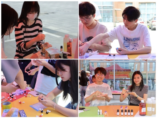 由本次多彩化学节以“青春有才,化海畅游”为主题,由“分子奥秘,邀你探索”化学元素大比拼、“日化手工坊”-生活中的化学、化学知识问答闯关等一系列活动组成。活动现场,情绪热烈、气氛高涨,同学们积极参与趣味活动,“日化手工坊”活动中,同学们探索身边的化学,在志愿者的讲解与指导下,通过现场提供的材料,耐心细致地亲手参与制作各具香味的手工皂和口红;“分子奥秘,邀你探索”活动中进行了化学分子模型拼接挑战,选手们热情投入,沉着冷静,经过思考分子构型与不断尝试,最终拼装出自己满意的模型。同学们积极分享着自己的所思所感,欢声笑语间充分认识到化学的趣味性。