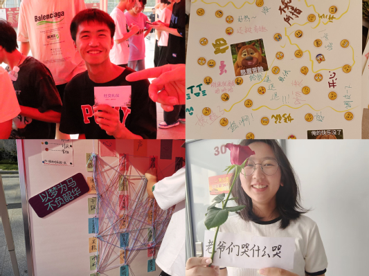 蒲公英素质拓展活动《迈出一步,遇到心声》,同学们在现场纷纷拿上提前分配的礼仪引导卡片,开始向周围路过的形形色色的行人上前普及礼仪常识,在活动的过程中,积极鼓励参与学生迈出勇敢的步伐,与他人沟通,引导参与学生分享自己的心路历程以及感受,增强自卑敏感学生的自信心。项目《心声漂巡,汇流成河》活动现场,每位同学在不同的两张纸条上写下一件自己不开心的事情,一件自己开心的事情,由各班心理委员收齐后交到负责人手中,由负责人进行分类,分别放置到“情绪垃圾箱”和“快乐收集箱”的两个盒子中,抒发情绪,调节心情。活动进行到后期,参与到其中的同学很多主动拿起手机拍摄展板,或驻足停下阅读展板上的便签与一个个暖心的话语和实用的解决方案,他们留下了自己不开心的事情,收获了他人的快乐。《心声心语,连线表意》主题活动现场,工作人员事先准备好一张白色大展板,在展板上贴上一些各式各样的标签,在标签上钉上钉子,由负责人介绍各种颜色毛线所代表的心情,如粉色毛线代表生气,紫色蓝色代表开心,绿色代表讨厌,棕色代表害怕。由路过的同学在自己喜欢或是讨厌的标签上进行缠绕,形成情绪线路,以此来表达自己的情感,更好的梳理自己的情绪。《不被标签定义的我》主题活动中,现场布置了各类标签纸,同学们发现自己不喜欢的标签之后可以把它撕下来,并在新的纸上写下自己想说的话再粘回板子上。通过这个活动,让大家了解自己、正视自己,引导同学们在生活中不被他人的目光和评价所束缚,同时保持理性客观的头脑,不轻易给他人贴标签,能更加自信从容的面对生活。