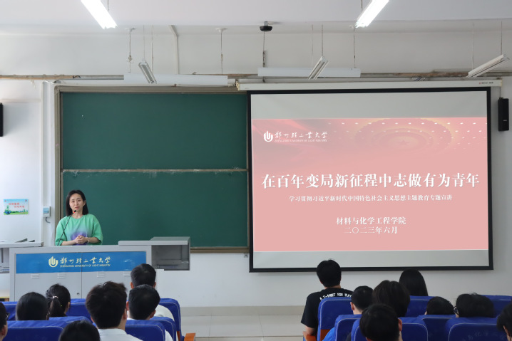 为深入学习贯彻习近平新时代中国特色社会主义思想,加强青年学生思想教育和理论学习,6月25日,材料与化学工程学院化工楼218教室开展学习贯彻习近平新时代中国特色社会主义思想主题宣讲。本次活动由校青年讲师团成员、材料与化学工程学院团委书记赵梦婕主讲,院团学骨干、青马班学员参加本次宣讲活动。
