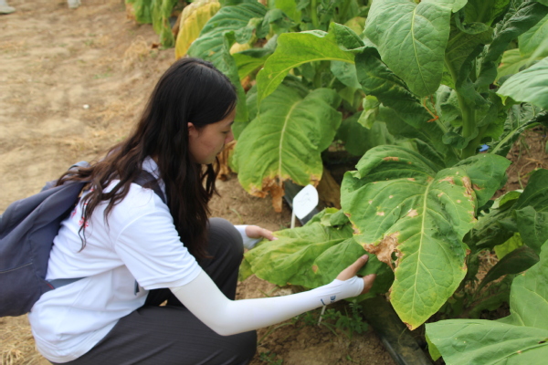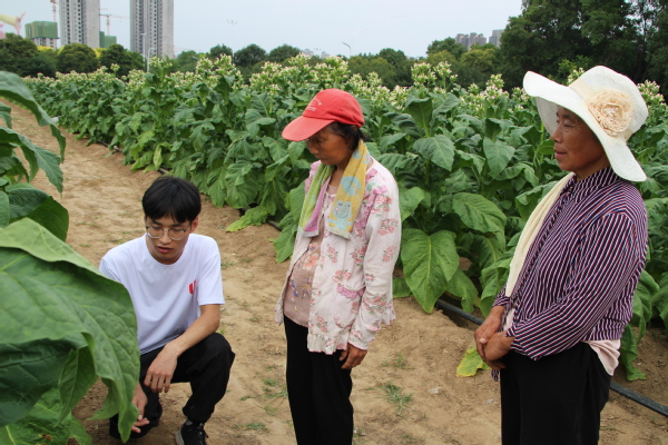 之后,实践团队成员在负责老师的带领下,走进烟田进行实地考察和调研。烟草种植生产需要投入大量的人工和物力,是一项非常辛苦的工作。在田间地头,队员们认真观察作物的生长情况并与农民积极沟通,针对田中烟草存在的病虫害、旱涝损伤等问题,为农户进行现场指导。针对夏季干旱缺水问题,团队成员提出可以采用喷灌、滴灌方式进行烟田灌溉,既可以节约用水,还可以避免大水漫灌造成烟草病害传播;也可以在烟草生长前期覆盖地膜,蓄水保墒,提高烟草的抗旱能力。对于涝灾,要在24小时之内及时排水,并把烟株扶正,施用适量肥料,补充烟草的营养,促进烟草生长。实践队员利用自身所学知识,为农户提供切实可行的建议,大家纷纷为大学生们竖起大拇指。
