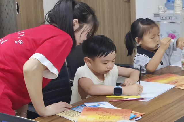 活动最后,实践队员邀请了几位小朋友来到会议室,采用PPT讲解和观看视频等易于接受的形式为其讲解关于党的成立的小知识。通过分享党的故事和英雄人物事迹进一步引导小朋友对党的敬佩与拥护。小朋友们以笔代言将对庆祝中国共产党成立102周年的美好祝愿画了下来,在增加宣传教育的趣味性的同时,也提高了小朋友在此次宣传活动中的参与感。