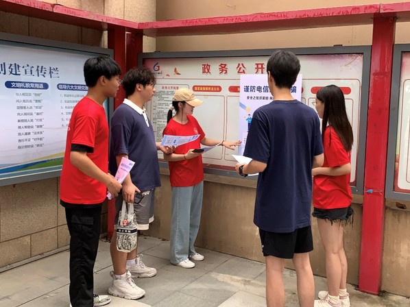 为进一步提升群众安全防范意识,减少电信诈骗违法犯罪活动发生,探索预防诈骗的有效手段,让防范电信诈骗进入社区,深入百姓心。2023年7月2日起,18新利直播 经济与管理学院同心筑盾志愿服务队在郑州市中原区开展防范网络电信诈骗宣传教育活动。