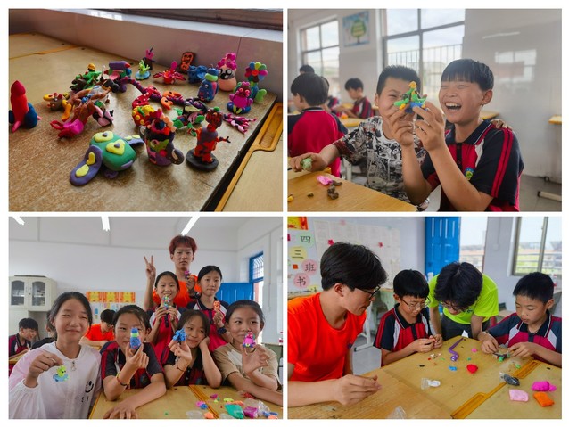 美育是审美教育,也是情操教育和心灵教育。7月6日,实践团队员们为庙头小学的小朋友们开展美育知识科普活动。志愿者通过视频为小朋友们展示了一系列充满创意的艺术作品,带领小朋友们从不同的角度进行艺术作品的鉴赏。随后,志愿者为小学生们分发彩色超轻粘土,鼓励他们大胆发挥想象,动手创造出独一无二的作品。创作中,小朋友们展现了天马行空的想象力和卓越的创造力,粘土作品中有能上天入地的蛟龙、千奇百怪的外星飞船,携带火箭筒、加特林的吸铁垃圾车,更有会飞的床和垃圾桶......在志愿者们的耐心启发和积极引导下,小朋友们用双手、想象诠释了童心耀七彩、美育润心田的美好愿景,进一步提升了认识美、理解美、欣赏美、创作美的能力。