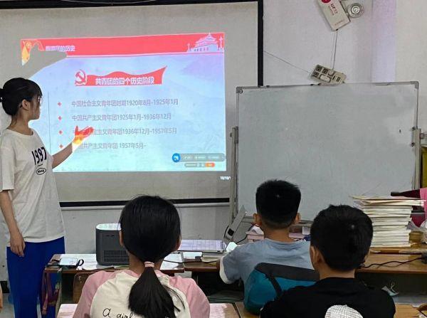 在广东江门,宣讲队成员组织中小学生宣讲团课,向他们介绍共青团的发展历史,增强中学生的历史使命感与责任感。面对小朋友,重点讲解了少年先锋队的历史、队旗和队徽的内涵等,引领少先队员积极向共青团靠拢,给他们的学习与生活指明方向。
