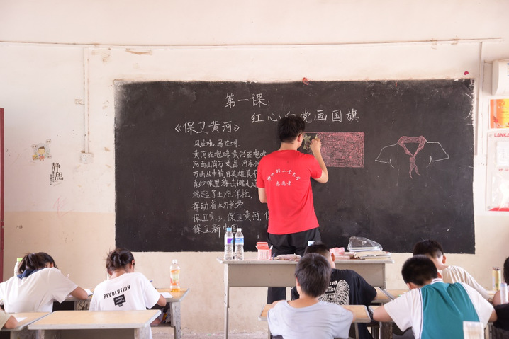 为了让孩子们了解国旗和国旗背后故事,团队成员带领着孩子们用彩色画笔,画出中国国旗。“红色的国旗代表着革命烈士的鲜血,国旗中的大五角星代表中国共产党…”团队成员讲解完毕,孩子们一笔一画的跟着团队成员完成了国旗的绘制,并写下了自己对祖国的热爱和美好祝愿。团队成员还通过带领孩子们学习《保卫黄河》,加深了他们对母亲河的了解。一曲《保卫黄河》让学生们仿佛又回到了民族危亡、中华儿女英勇抗敌、保卫祖国的年代。团队成员们逐字逐句地带领孩子们歌唱,在朗朗歌声过后告诉孩子们:“建设祖国,实现中华民族伟大复兴是每个中国人的心愿,更是我们青少年一代义不容辞的责任与使命!我们作为新时代的新青年,要热爱祖国,珍惜和平年代的幸福生活,踔厉奋发,砥砺前行,不断进取,为祖国事业增砖添瓦!”