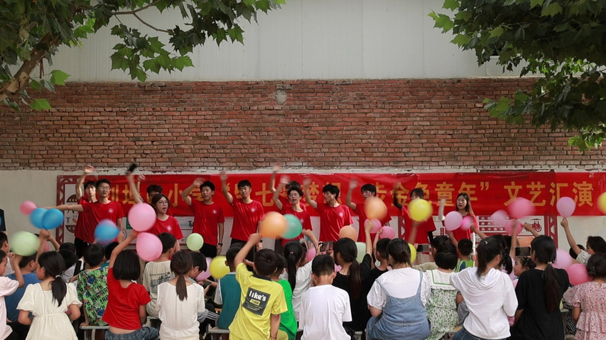 7月10日团队成员们组织全校学生开展了振奋人心的文艺汇演来检验成果,展现孩子们的青春活力。孩子们精心准备的节目点燃了夏日的激情,嘹亮的歌声与欢快的音乐此起彼伏,台上台下热情四溢。团队成员们也参与到其中,激情献唱,小朋友们拿着五颜六色的气球,随歌声律动,随旋律摇摆,融洽无间。演出活动在团队成员带领下,全校师生合唱《虫儿飞》中落下帷幕。