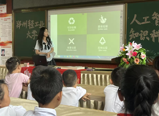 在当地学校的协助下,软件学院人工智能科技普及小分队为灵宝市第三实验小学的学生进行了宣讲。宣讲会上,小分队首先介绍了人工智能创新团队和黄万伟博士,并向孩子们介绍本次宣讲的目的,之后使用PPT和视频演示的形式,通过通俗的语言详细讲解了为什么要垃圾分类,垃圾分类的好处和垃圾分类的标准,并举例说明各类垃圾的具体分类方法。通过提问例如,“垃圾分类的标准是什么?”“吃剩下的大骨棒是什么类别的垃圾?”“用过的纸巾是什么垃圾?”等问题,帮助孩子们巩固所学知识。在这个过程中,孩子们踊跃举手发言,小分队成员对回答正确的孩子们进行鼓励,对回答有所偏差的同学及时补充纠正,鼓励孩子们下次继续举手发言,配合奖励学习用品的措施,激发孩子们的参与积极性。小分队成员以生活中的小例子入手,使孩子们更加清晰地理解垃圾分类的意义,明白了垃圾分类需要从身边的小事做起,提高了环境保护意识。