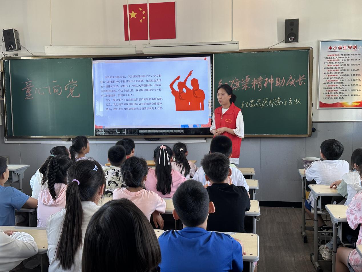 红苗志愿服务小分队的队员们先后在郑州、焦作、驻马店等地的小学,通过PPT和视频等形式,围绕明红旗渠历史、讲红旗渠故事、传红旗渠精神三个方面对林州人修建红旗渠的艰难历程,红旗渠精神的实质以及新形势下如何做传承好“红旗渠精神”的新时代好少年等作了全面深入解读和细致阐释分析。引导新时代的少年们从红旗渠精神中汲取养分,树立崇高信念,传承弘扬迎难而上、不怕啃“硬骨头”的红旗渠精神。