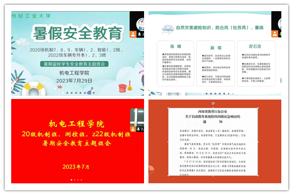 近期,我省将连续出现强降雨天气,为提高留校学生的安全防范意识,机电工程学院及时召开暑期留校学生安全教育主题班会。班会由辅导员通过线上召开,覆盖全体暑期留校学生。