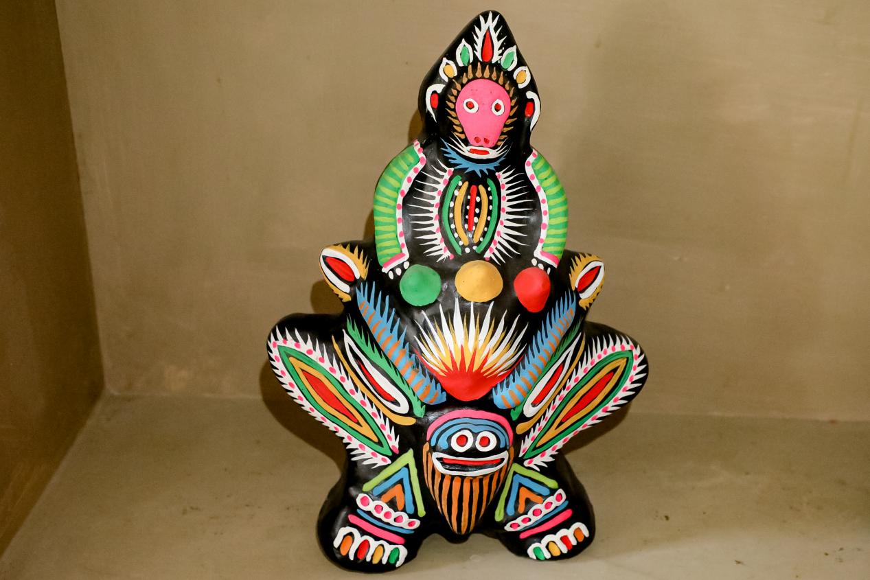 在理论课程的学习后,兴趣盎然的同学们便开始了泥泥狗的“彩绘”过程,绘制的时候,许述章老师讲解道:“淮阳泥泥狗以黑为主,据古书记载:“夏后氏尚黑”,夏代祭祀的太庙是黑色,祭器也是黑色,泥泥狗以黑色打底,延续着古代“尚黑”的遗风。而在黑色上再施以红、黄、青、白色,统称“五色”,色彩对比强烈,而又不失和谐。”
