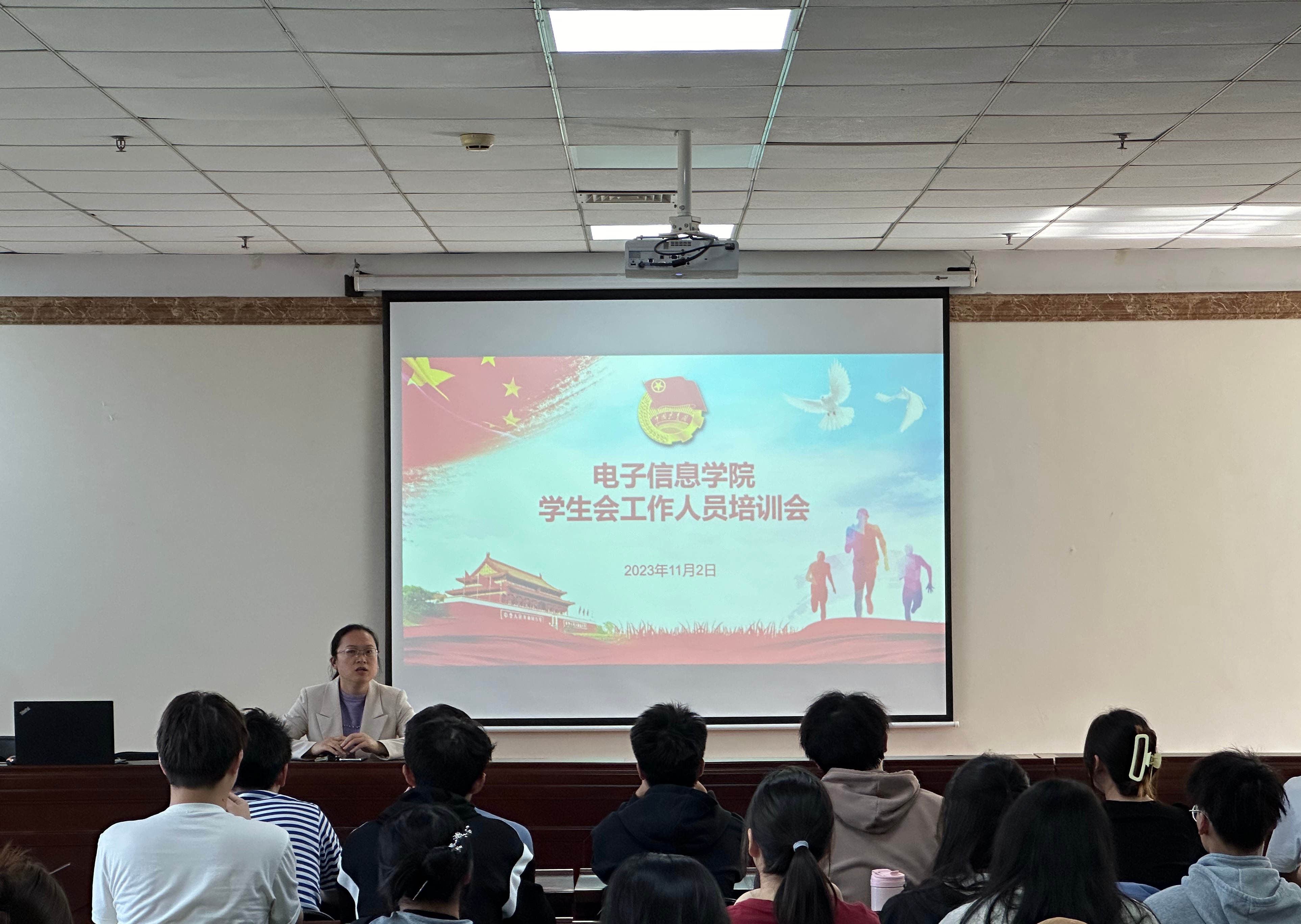 为深入学习贯彻习近平新时代中国特色社会主义思想,加强学生会工作人员作风建设,塑造良好的组织形象。 11月3日中午,电子信息学院在四教楼503会议室召开2023年秋季学期学生会工作人员培训会。学院团委书记周芳华、院学生会全体成员参加了此次会议。