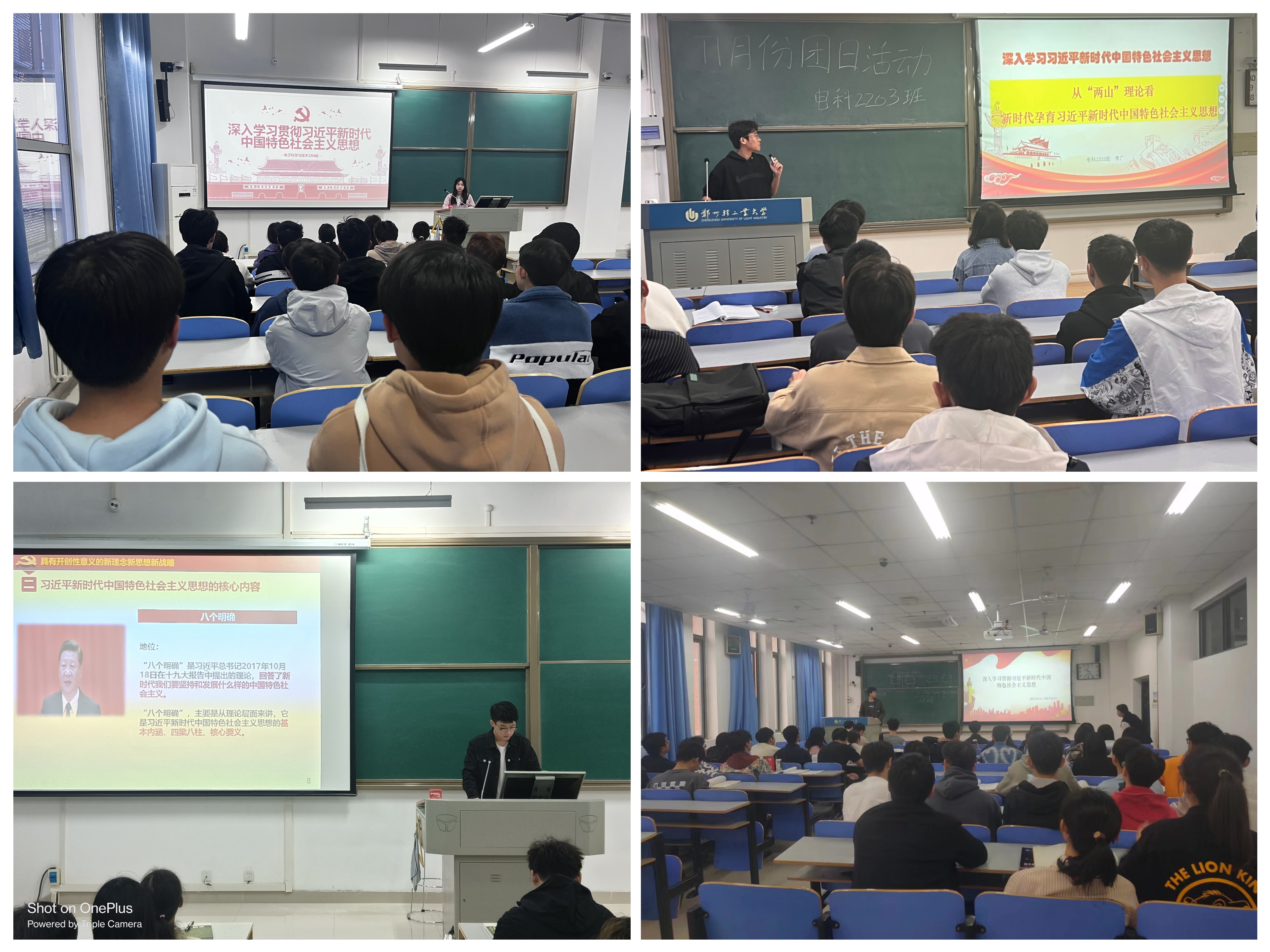 在活动中,各团支部通过PPT主题宣讲、观看影像资料等多种形式,带领支部成员深入学习了习近平新时代中国特色社会主义思想的主要内容,重点围绕“十个明确”、“十四个坚持”、“十三个方面的成就”等内容展开学习讨论。观看了党的二十大召开的视频资料,学习了习近平总书记考察调研中国人民大学重要讲话精神和《习近平总书记与大学生朋友们》一书的部分章节,分享了《习近平和他的大学朋友们》的阅读感悟。同学们纷纷表示要认真学习领会习近平新时代中国特色社会主义思想和党的二十大精神,做有理想、敢担当、能吃苦、肯奋斗的新时代好青年。