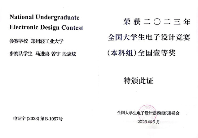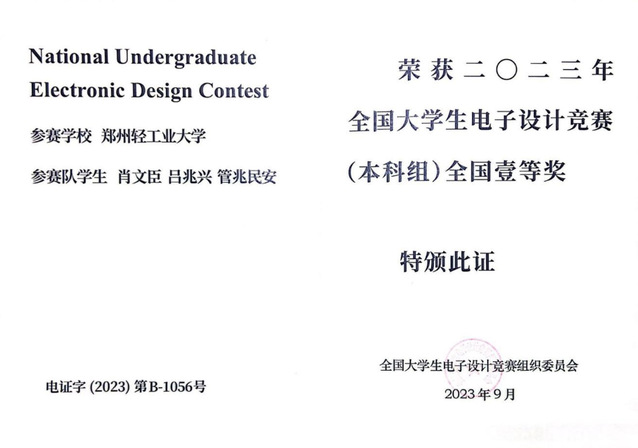 11月18日至11月19日,2023年全国大学生电子设计竞赛总结暨颁奖大会在北京举行。电气信息工程学院教师指导学生荣获全国一等奖2项,全国二等奖1项,省级一等奖7项、二等奖7项、三等奖1项,取得参加全国大学生电子设计竞赛以来最好成绩,为学校总成绩位居河南省参赛本科高校第二名提供了强力支撑,获奖详细情况见附表。