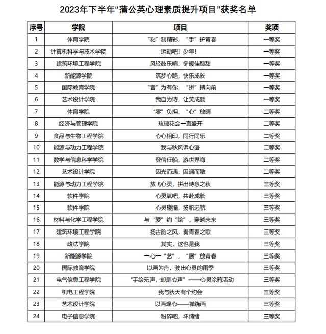 12月14日下午,2023年下半年“蒲公英心理素质提升项目”评审交流会分别在两校区举行。本次活动由心理健康教育中心主办,各学院心理健康教育专职辅导员和各级蒲公英使者参加。经过评审,350个“蒲公英心理素质提升项目”全部顺利结项,47个项目参加评审交流,其中24个项目脱颖而出,分获一、二、三等奖(见附件)。