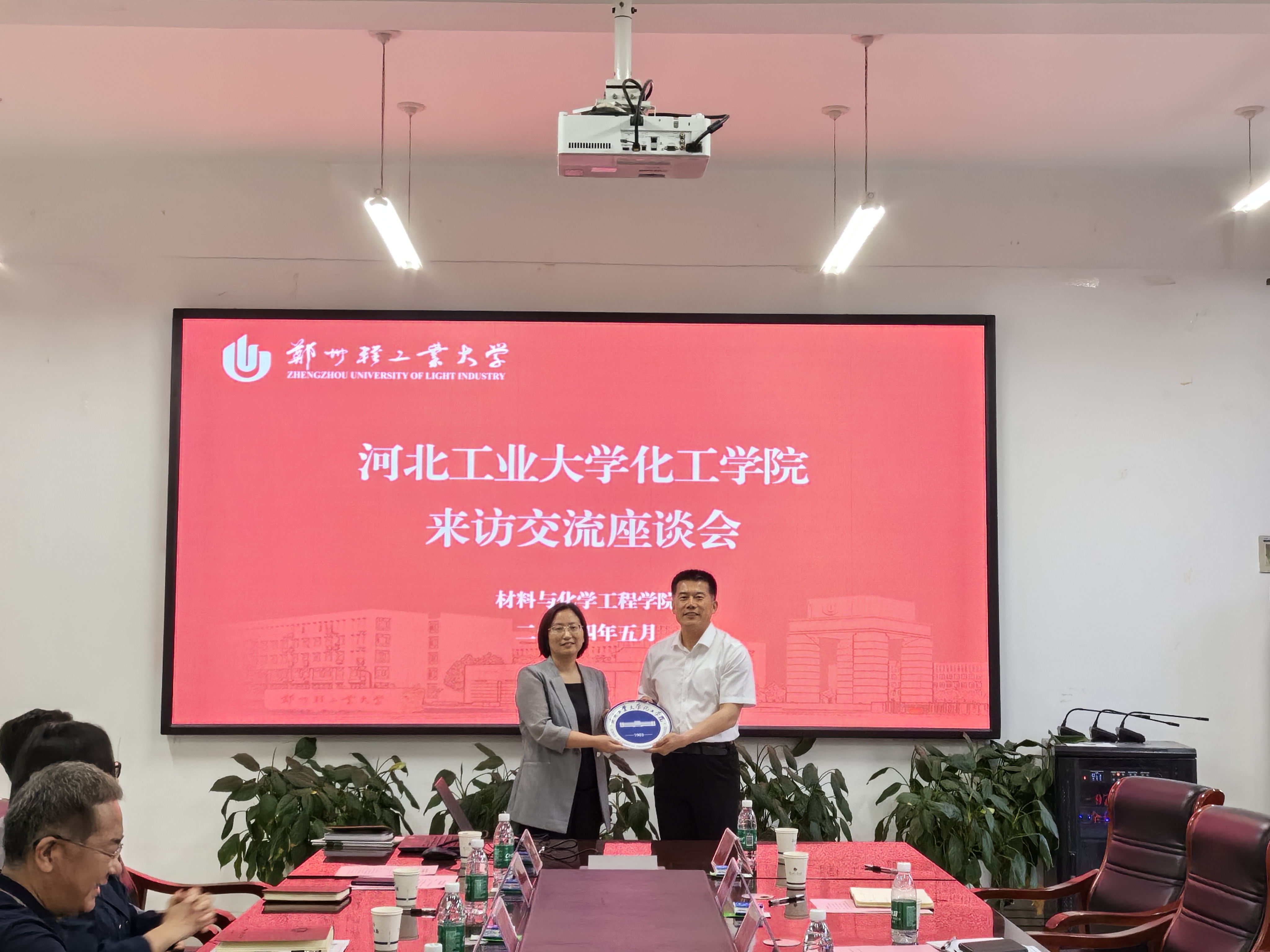 郭书记介绍了河北工业大学化工学院历史沿革、学院概况、教学概况、学科建设、平台建设、社会服务、学生工作、党建工作等情况,展示了近年来学院在产学研一体化过程中取得的代表性成果,并赠送河北工业大学化工学院纪念品。