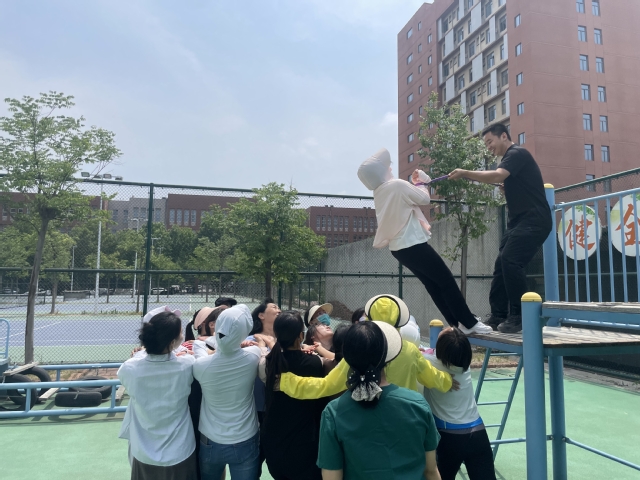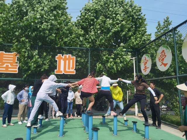 在简单的热身运动后,女教职工们按照分组,有条不紊地投入到紧张而富有意义的拓展活动中——两组队员手拉手,相互鼓励、彼此支持,以稳健的步伐从高低错落、间隔不等的梅花桩中穿过,共同完成了第一个项目穿越梅花桩。在珠行万里项目中,两组队员在巧妙配合和精准操作下,成功将小球从起点传输到终点。第三个项目盲目障碍则考验了女教职工们的信任感和协作能力,通过队友的肢体交流,“闭眼”的老师们克服重重障碍,顺利通过障碍桥。最后的项目信任背摔将活动推向了高潮,面对1.2米的高台,女教职工们克服内心的恐惧,在队友们的坚定支持和配合下,勇敢地完成了背摔动作。