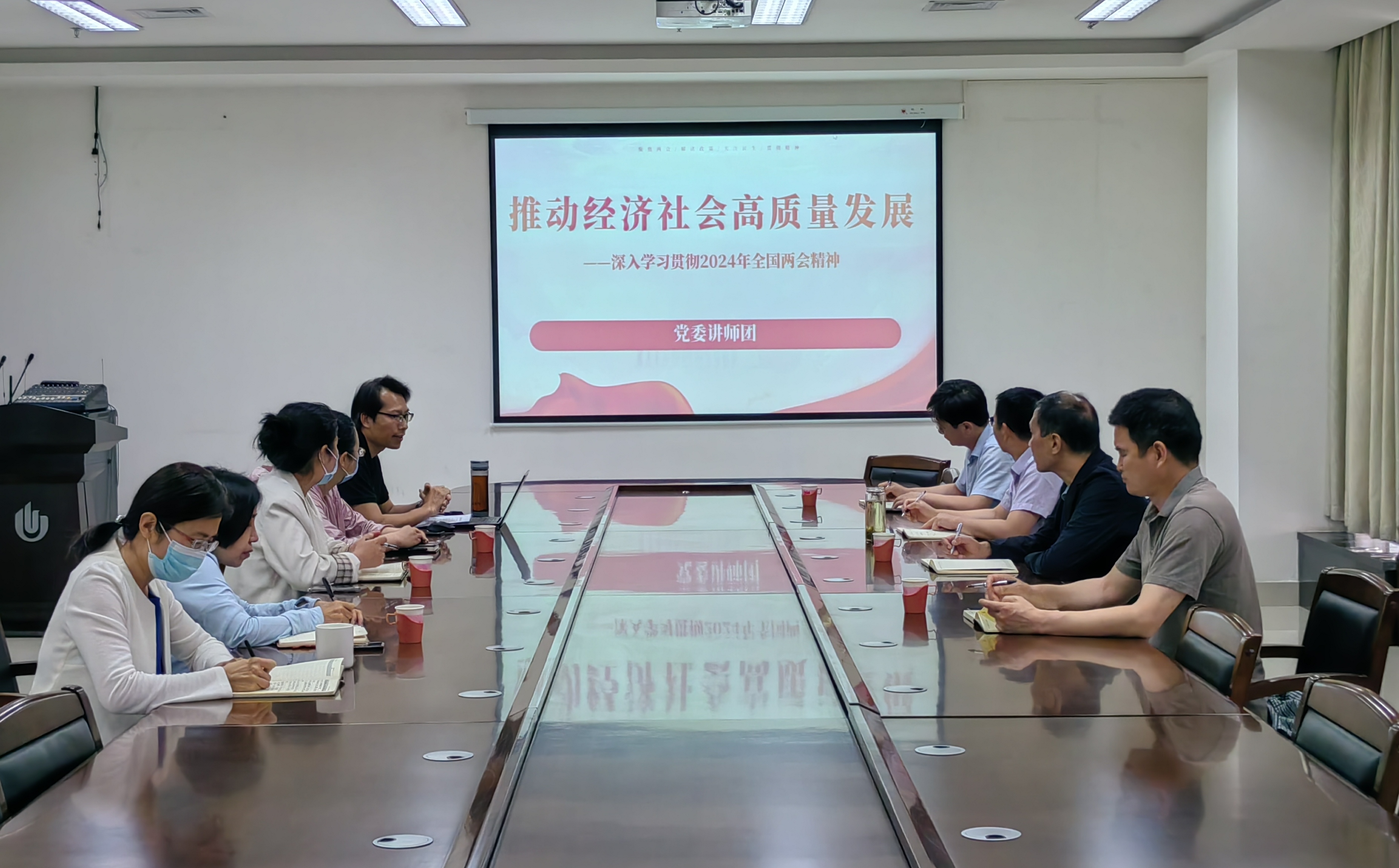 宣讲会上,张少停博士首先以《推动经济社会高质量发展——深入学习贯彻2024年全国两会精神》为题,从“2024年全国两会的中心任务和基本情况”“习近平总书记在全国两会上重要讲话精神的精髓要义”“2024年政府工作报告的工作部署”等三个部分全面概述了两会主要内容,重点讲解了习近平总书记两会期间关于新质生产力、全面深化改革等的重要论述,系统解读了政府工作报告的总体要求、政策取向和工作任务。
