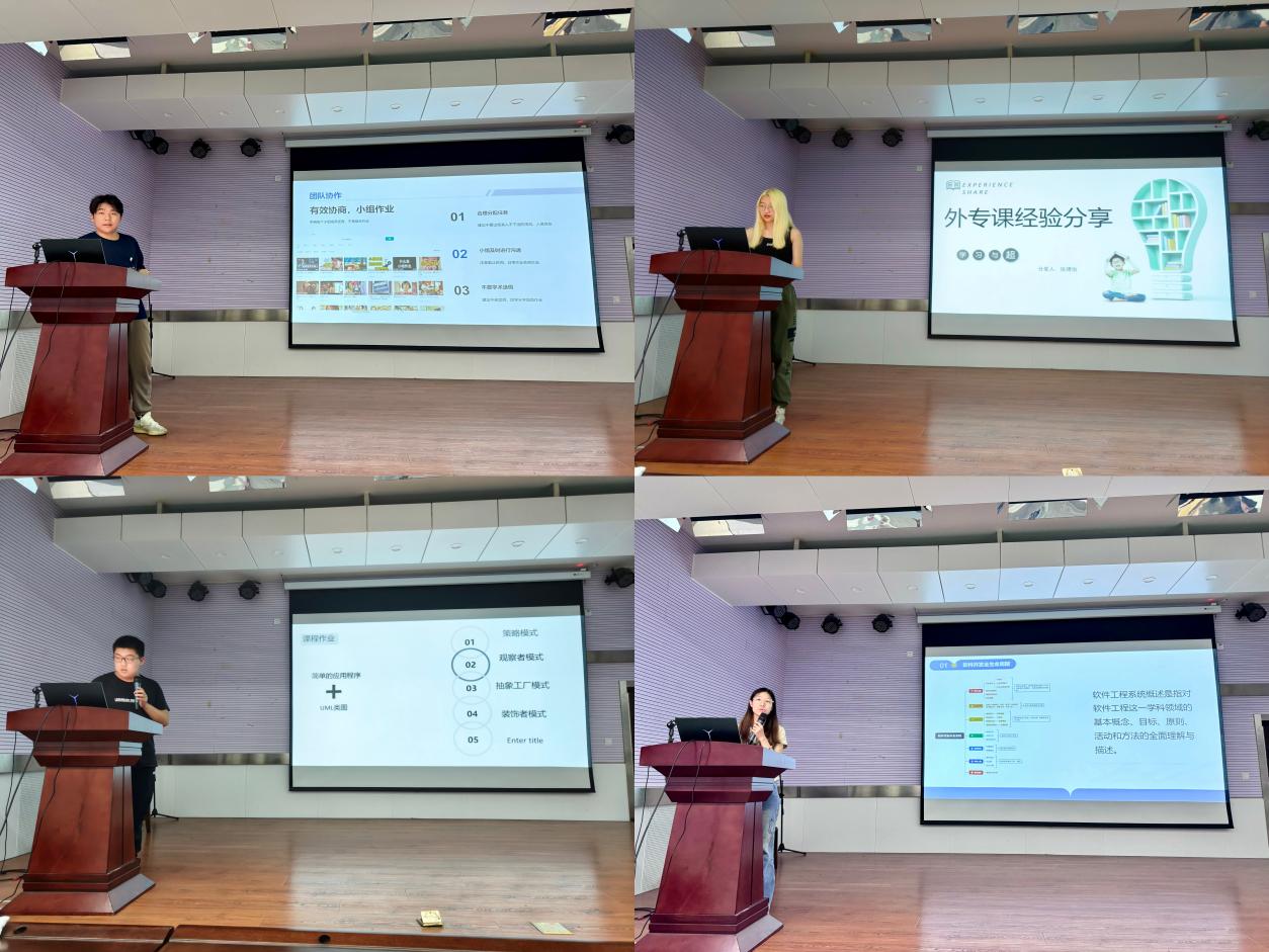 在分享会上,各位学生代表结合自身学习经验,分享了他们在软件工程专业外专课学习中的心得体会和学习技巧。他们围绕如何高效利用外专课资源、如何克服学习中的困难、如何提升学习效率等话题展开了深入讨论,为在座的23级同学们提供了宝贵的建议和启示。