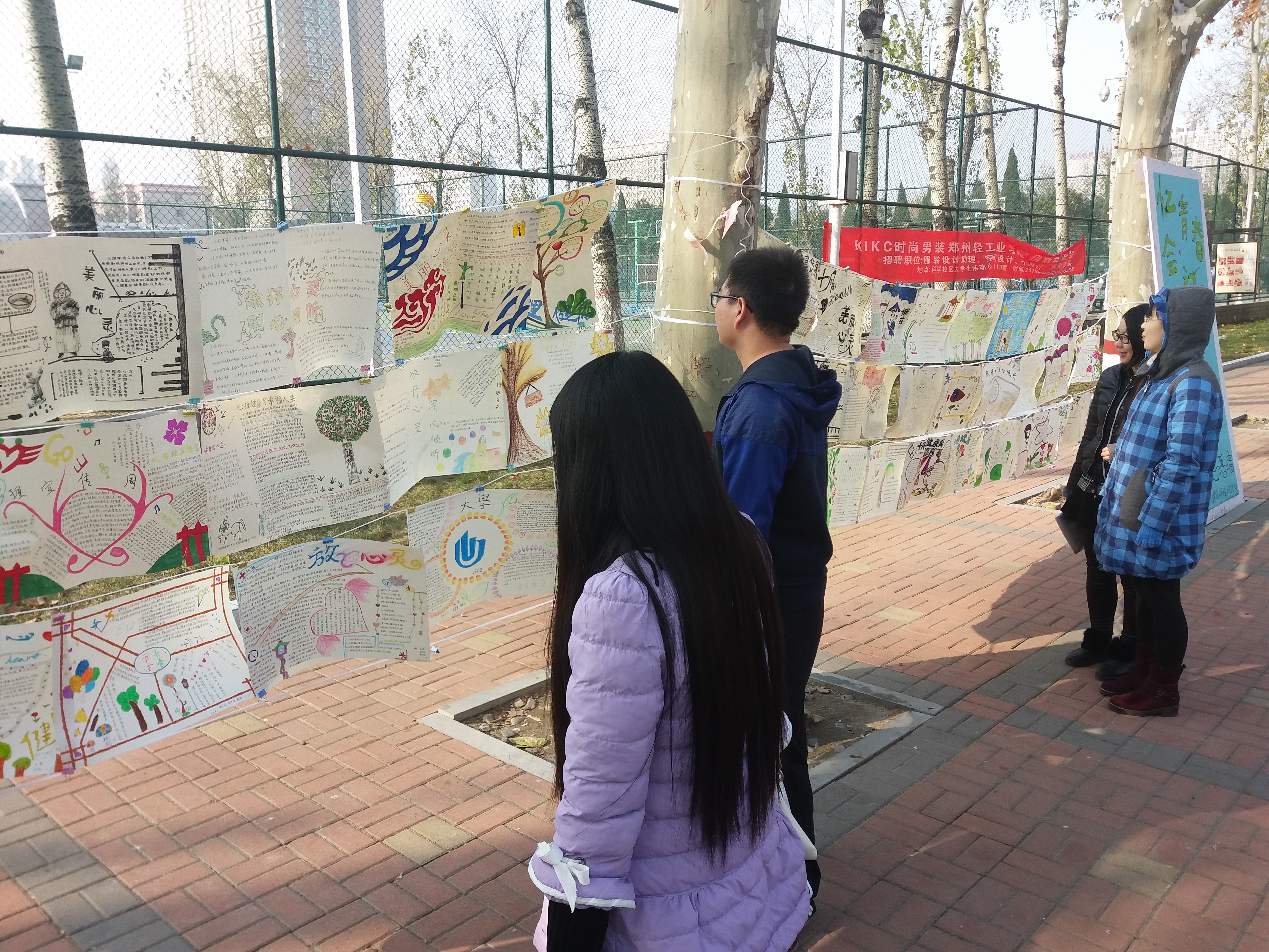 本次活动于中午十二点开始,展出建工学院14、15、16年的手抄报优秀作品。展览期间,过往的学生被多彩的手抄报界面吸引,纷纷驻足参观。其中就有即将毕业的大四学姐,竟然意外发现了昔日自己的作品被展览出来,不禁感慨万千。当被问到是否还记得当时创作手抄报时的情景时,学长记忆犹新,侃侃而谈,将自己近四年大学的学习经验与现场的学弟和学妹们进行了分享,并提出了许多的建议和忠告。