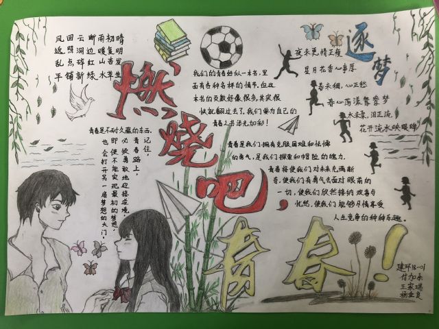 参加活动的同学在脑海中描绘出一幅幅充满青春活力的画面,在手抄报上用缤纷多彩的颜料描画出自己多彩的青春,用一段段激昂的文字书写着灿烂的青春。将自己青春的心灵之声书写绘画成立意新颖、创意独特的手抄报,让观者透过精美的手抄报便可感受到来自青春的活力。绚丽的图案、生动的语言文字、真实的情感,充分展示了同学们对“燃烧吧,青春”主题的共鸣。获得一等奖的建筑环境与能源应用工程18-01班付佳乐同学表示,不仅要在纸张上书写自我的青春,更要在今后的大学生活中不忘初心、不负韶华,让青春更加出彩。