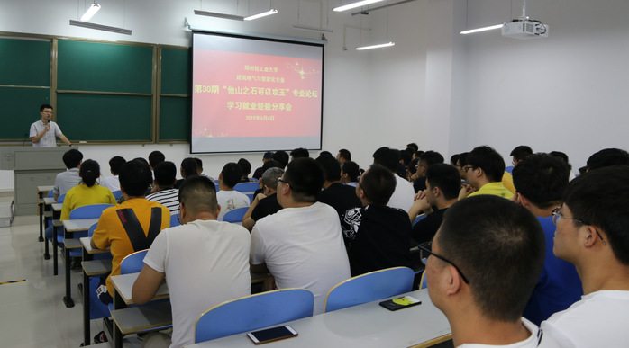 6月6日下午,我校建筑环境工程学院在科学校区双创楼108教室举办了建筑电气与智能化专业“他山之石可以攻玉”专业论坛第30期――学习就业经验分享会。该专业2015- 2018级四个年级的学生代表共60余人参会,会议由该专业负责人吴艳敏和武东辉主持,建筑环境工程学院副院长陈继斌和曹祥红到会并与学生们展开交流。