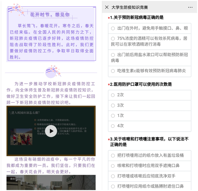 此次竞赛通过线上问卷的形式展开,充分利用网络渠道普及新冠肺炎防治知识,增强广大学生的疫情防控意识。竞赛题目紧密结合疫情防控信息,包括国家政策、病毒特性、防御手段、甄别谣言等多个方面,全方位、多层次地帮助大家学习防疫知识。竞赛过程中,同学们态度端正、答题积极性高涨。大家通过答题链接进入网页中参赛作答,提交后网络后台自动计分,满分为100分。