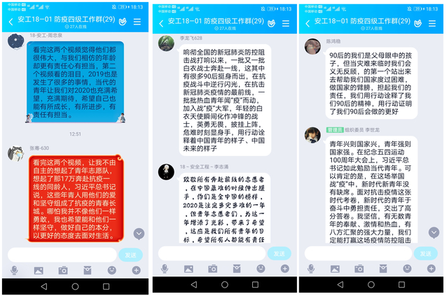 活动中,各班级团支部通过QQ群、腾讯会议、钉钉等平台,以观看视频、PPT分享、线上研讨等方式开展学习。各班级或是重读习近平总书记给北京大学援鄂医疗队全体“90后”党员的回信,或是观看河南青年讲师团成员网络宣讲《战“疫”烽火,点燃青春赞歌》主题团课,或是回顾党团结带领全国人民打赢疫情防控阻击战的突出成效,或是分享身边疫情防控志愿服务的先进事迹。同学们纷纷表示,2020年是全面建成小康社会的收官之年,站在两个100年奋斗目标的历史交汇点上,身为90后、00后的团员青年应当用实际行动展示当代青年蓬勃向上的精神面貌,展现当代青年捍卫青春中国之姿态,践行为人民服务的初心和使命。