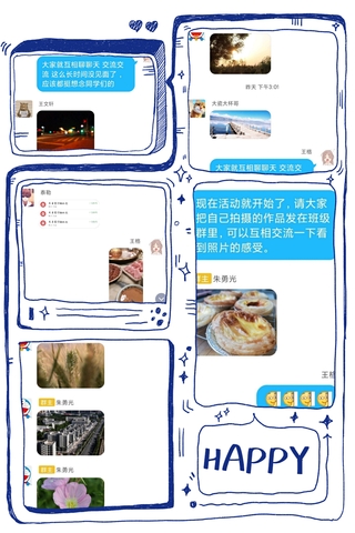 活动的第一个阶段,同学们在为期一周的时间里,留心自己生活的环境,在线下用手机拍摄下自己认为值得记录的照片或者视频,并依托这些拍摄作品保留下自己当时的心情和感受。在拍摄作品的过程中,大家从平时容易被忽略的事物中找到快乐,在亲手记录作品的过程中又收获到了成就感。活动进行到第二阶段,主持人组织同学们在线上班级群里分享自己的拍摄作品和拍摄时的心情,鼓励同学们去欣赏和体会别人的作品。同学们分享的过程也是一个集体进入回忆的过程,在这个过程里悲伤被缩小,快乐被放大,每个人能体会到来自不同地方的幸福和喜悦,也能分担彼此遇到的烦恼和悲伤,隔着大大小小的屏幕在家里也感受到同学的陪伴和集体的温暖。