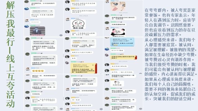 活动开始,由心理委员介绍了活动规则,并讲解了夸夸群意义。活动过程,分为两个部分,一部分是夸夸你眼中的同学。在夸夸群中,“文曲星转世”、 “大佬”、“锦上添花”、 “大神”、“语言大师”等等,各种各样的甜言蜜语,轮番轰炸,愉悦的气氛感染者参与活动的同学。另一部分是说说对方眼中的你,使自己认识到不一样的自己,从多多维度去认识自己,更加透彻的了解自己,才能反省自己,让自己成为更好的自己。活动结束后,同学纷纷表示,身在其中,感受到了欣赏、认同、理解、接纳和满足。同时,也从他人的角度拓宽了自我认识,促进自身的成长。