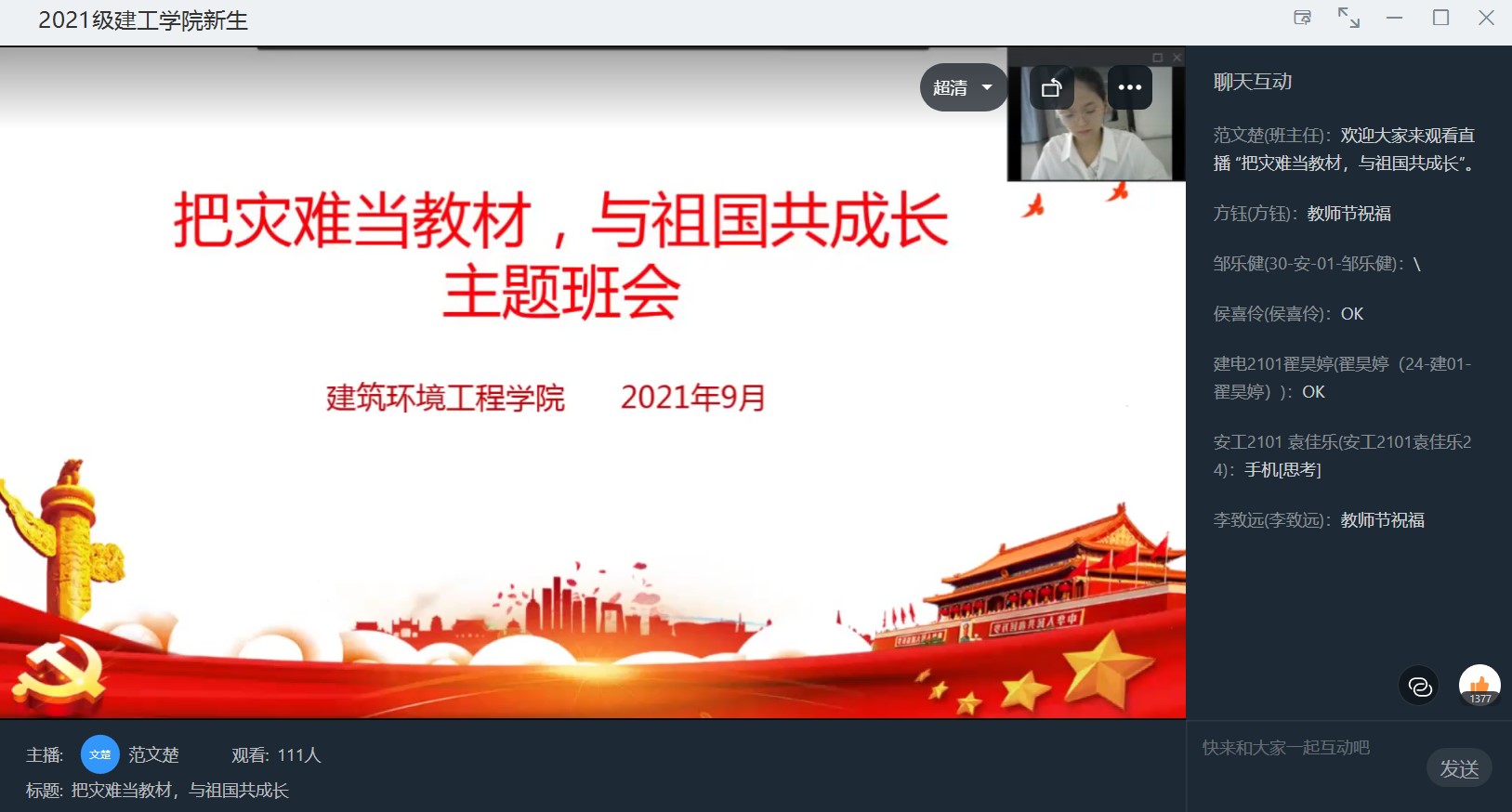 为激发2021级新生的责任担当,引导学生把灾难当教材、把困难当磨砺,做到在灾难面前与国家共患难、与人民共进步,为切实加强疫情防护下的学生思想道德教育工作,真正做到“停课不停教、不停学”,建筑环境工程学院于近日开展“把灾难当教材 与祖国共成长”网络主题教育活动班会,2021级新生辅导员范文楚以及全体新生参加了本次会议。