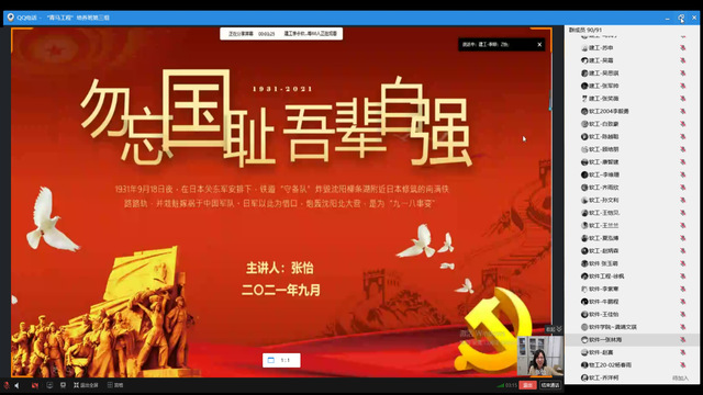 为纪念九一八事变暴发九十周年,引导青年学生牢记历史、勿忘国耻,厚植爱国主义情怀,9月18日晚,建筑环境工程学院辅导员张怡以“勿忘国耻,吾辈自强”为主题为院级“青马工程”培养班第三组学员授课。