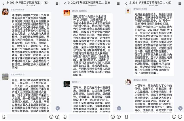 本次活动中,各团支部通过观看视频、主持人讲解PPT、线上研讨等方式解读会议的基本情况、学习十九届六中全会的重要内容。全会讨论了习近平受中央政治局委托作的工作报告,审议通过了《中共中央关于党的百年奋斗重大成就和历史经验的决议》,审议通过了《关于召开党的第二十次全国代表大会的决议》。此次会议全面总结了党的百年奋斗重大成就和历史经验,深刻揭示了“过去我们为什么能够成功”,深入阐述了“未来我们怎样才能继续成功”。伟大成就鼓舞人心,宝贵经验弥足珍贵,历史使命催人奋进。同学们纷纷表示,要以史为鉴、开创未来,埋头苦干、勇毅前行,为实现第二个百年奋斗目标、实现中华民族伟大复兴的中国梦而不懈奋斗。