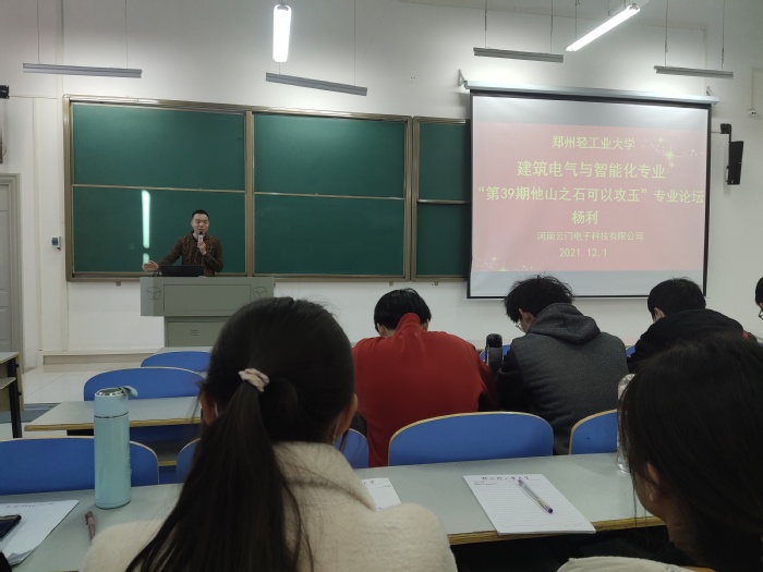 校内实习,包括2期专业论坛、2个视频讲座和校内参观等内容。2期论坛是指成功举办第39-40期“他山之石可以攻玉”专业论坛,分别邀请了河南云门电子科技有限公司总经理杨利和本专业优秀校友、中国电科22所天博电子信息科技有限公司国际事业部技术主管付强作现场报告;2个视频讲座包括《智慧城乡与民生》、《首届“盈嘉杯”开发者金牌训练营行业理论课程》;校内参观则完成了校内双创楼高低压供配电室的参观实习。