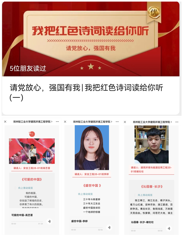 经过广泛宣传,青年学子热情响应、踊跃参与,学院从投稿的诗词诵读音频作品中遴选出优秀作品在学院微信公众号陆续展播。在方志敏《可爱的中国》中,诵读人深情朗诵这用忠诚和热血书写下来的文字,读出对祖国母亲的深情告白;《水调歌头·游泳》展示出一代伟人毛泽东的英雄气概及他对社会主义祖国无限深厚的感情;《七律·人民解放军占领南京》抒发了欢庆南京解放的革命豪情和对将革命进行到底的坚定信念。一字字、一句句,同学们用高亢、沉重、亦或是舒缓的朗诵抒发了对党、对祖国的无限热爱,表达了弘扬正能量、奋斗新时代、争做追梦人的坚定信念,充分展现了学院青年学子昂扬向上的精神风貌。