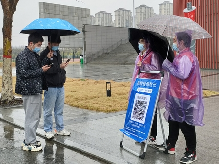 志愿者们在做好自身防护的同时,身着志愿马甲、佩戴袖章上岗,值守在核酸检测区、餐厅、教学区等疫情防控执勤点。在核酸检测中,志愿者冒着大雨进行志愿引导、秩序维护,并为现场同学答疑解惑,以饱满的热情和积极的状态引导师生顺利进行核酸检测。在餐厅,志愿者们提醒前来就餐的同学自觉遵守防疫要求,就餐前后佩戴好口罩、有序乘坐电梯、保持一米的安全距离,并在购餐排队窗口、餐具回收处进行文明督导,确保食堂用餐高峰期防疫工作的有序进行。在教学区,志愿者们在教学楼出入口、电梯口等人流密集处站岗执勤,维持教学楼出入口秩序,引导同学们有序排队,提醒师生戴好口罩,并为没有佩戴口罩的同学分发口罩。他们不畏大雨和寒风,坚守在岗位,认真做好各项疫情防控工作。