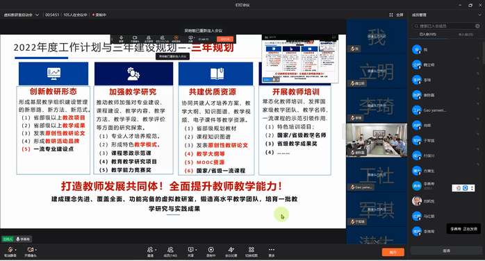 接下来虚拟教研室举办了首场专业建设报告。西安建筑科技大学于军琪教授以本校国家级虚拟仿实验教学项目——大型公共建筑中央空调系统控制与节能优化为例介绍了国家虚拟仿真项目申报和建设经验。南京工业大学方志教授以南京工业大学建筑电气与智能化专业为例分享了本校专业认证与工程教育认证的经验。苏州科技大学付保川教授介绍了近年来苏州科技大学建筑电气与智能化专业作为国家级一流专业建设点取得的建设成果。其他院校专家也从虚拟教研室建设、一流课程建设等方面进行了发言和交流。